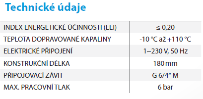 Vysoko efektívne, elektronicky riadené, bezúdržbové, mokrobežné čerpadlo s pripojením na závit, so synchrónnym motorom, odolným voči zablokovaniu podľa technológie ECM (až 90% úspora energie v porovnaní s neregulovaným čerpadlom) a integrovanou elektronickou reguláciou výkonu na plynulú reguláciu rozdielu tlaku. Použiteľné pre všetky vykurovacie a klimatizačné zariadenia. Regulačný režim voliteľný podľa použitia pri kúrení radiátormi/podlahovým vykurovaním. Ovládanie Δp-c/Δp-v/I, II, III.